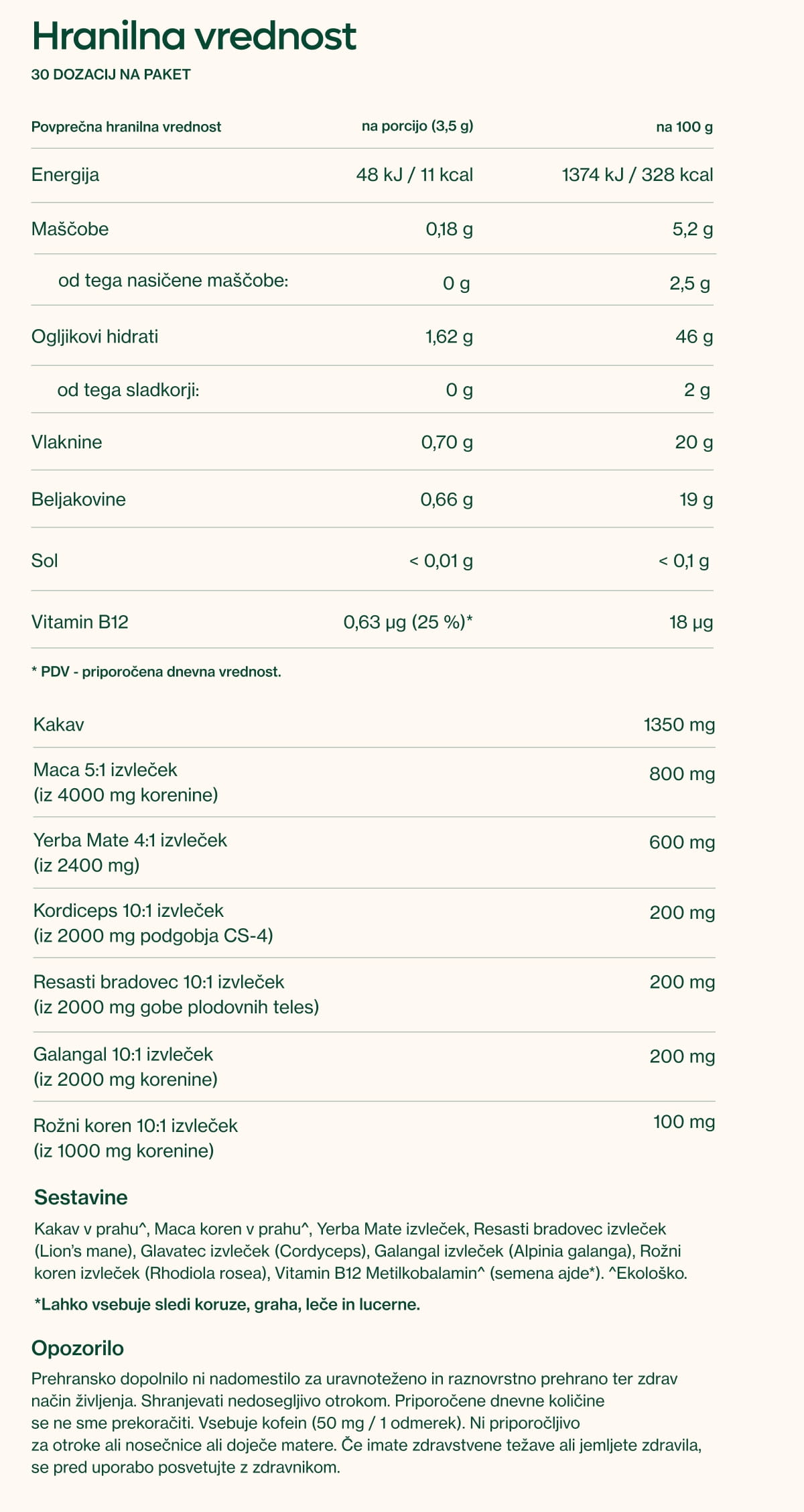 Za dvig energije, izboljšanje fokusa in podpore delovanja možganov brez energijskih padcev in živčnosti. Okusen napitek, ki nadomesti 2-3 kave na dan.