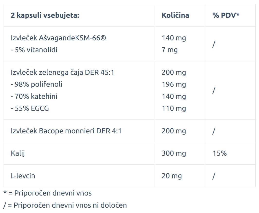 ¹ Bacopa Monnieri pomaga izboljšati koncentracijo in spomin ter ohranjati kognitivne funkcije. (EFSA-Q-2008-4701) ² Ašvaganda izboljša odpornost telesa na stres. Pomaga ohranjati duševno ravnovesje. (EFSA-Q-2008-4905) Ašvaganda podpira v obdobjih mentalne in živčne napetosti in tesnobe. Prispeva k optimalni sproščenosti. Prispeva k čustvenemu ravnovesju in splošnemu dobremu počutju. (EFSA-Q-2008-2916) ³ Kalij prispeva k delovanju živčnega sistema.