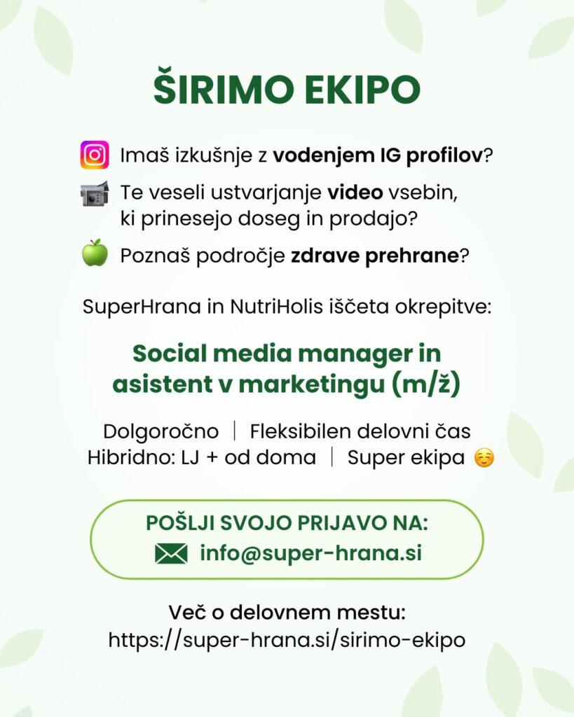 Na Superhrana & Nutriholis širimo znanje o zdravi prehrani, prehranskih dopolnilih in dobrem počutju. Smo ekipa 8 entuziastov, ki verjamemo v sodelovanje, odprto komunikacijo in skupno rast. Zaradi širitve ekipe vabimo kreativno, ambiciozno in samoiniciativno osebo, ki bi z nami soustvarjala našo digitalno zgodbo.