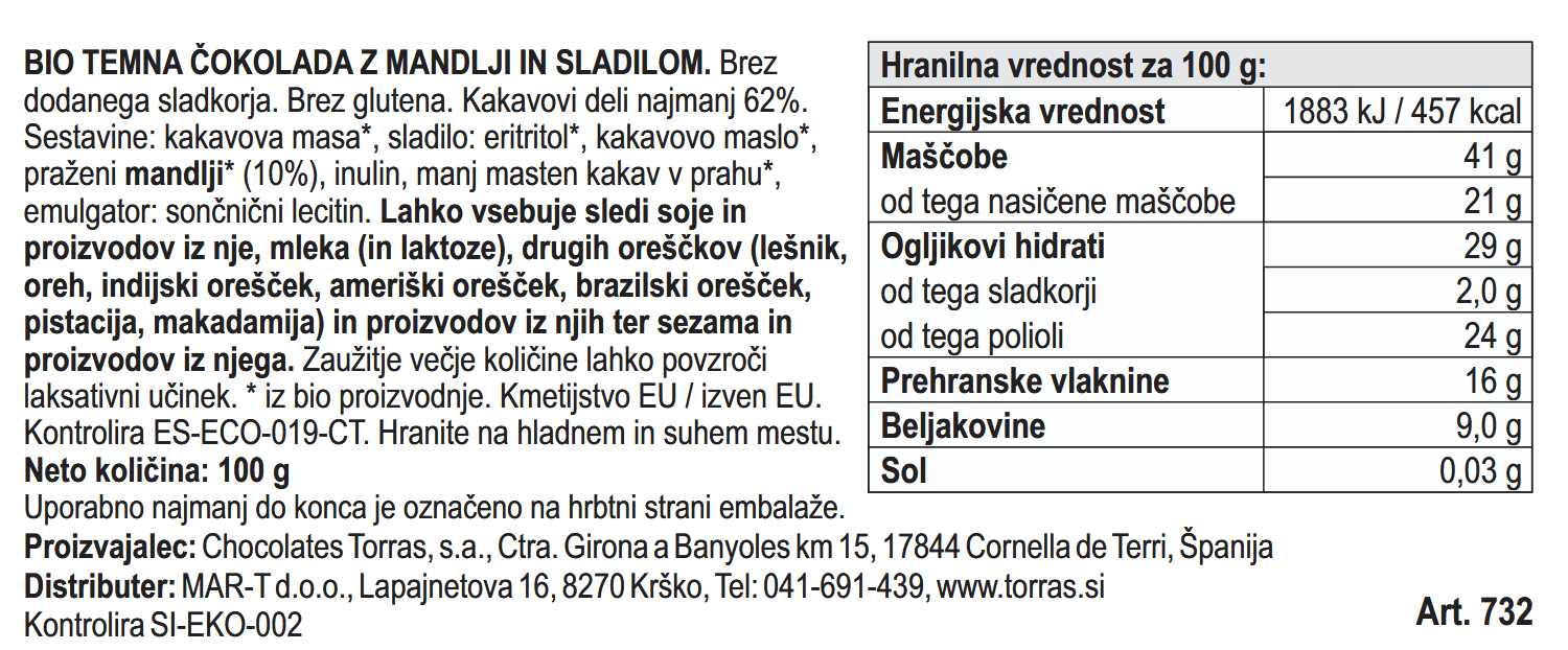 Temna čokolada z 62% deležem kakava, ki jo popestrijo še okusni mandlji. Brez dodanih sladkorjev – sladkano samo z naravnim sladilom.